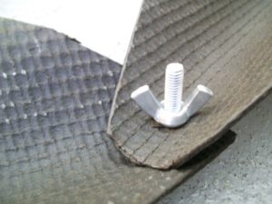 Ensuite, percez vos rails, pas trop prêt des bords ni trop loin des extrémités du rail. Un diamètre de 8mm est un bon compromis entre la taille et contraintes imposées à la tôle ondulée bitumée. Il ne restera plus qu’à le relier entre eux avec une vis et un papillon, permettant au rails de rester en place lorsqu’une voiture fait une sortie de piste.
