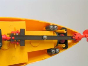 L’hélice est dirigée à l’aide d’une tige noire, elle-même actionnée par un servomoteur. Le mouvement gauche-droite est donc assuré, en plus de la rotation classique de l’hélice permettant le mouvement du sous-marin. Ingénieux !