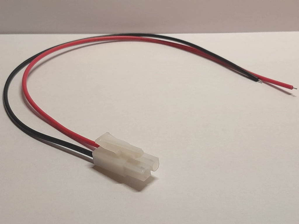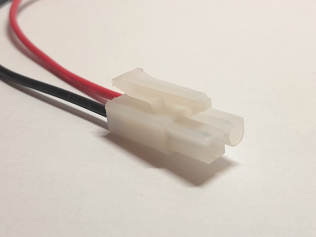 Prise Tamiya mâle, avec fils standards, prenant place sur un véhicule ou sur un chargeur.