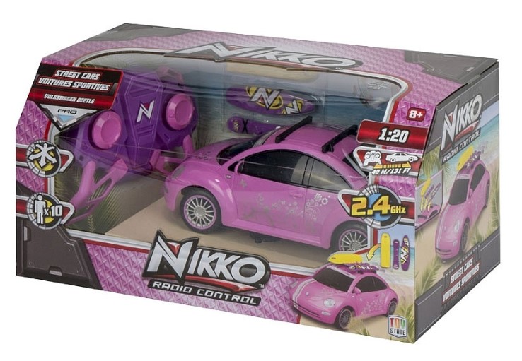 La gamme des Nikko Street Cars Pro comprend plusieurs véhicules, dont une jolie Volkswagen New Beetle rose. Ces véhicules sont exclusivement destinés à un usage intérieur sur sol lisse.